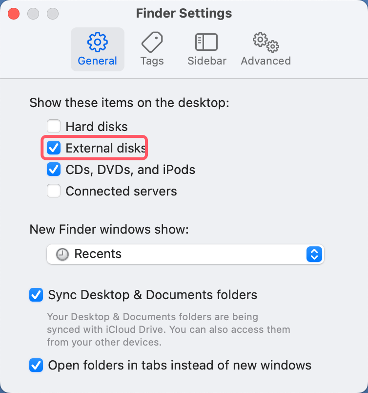 - Check Finder Settings: Go to Finder > Settings, then click General and Sidebar, ensure External disks is selected.